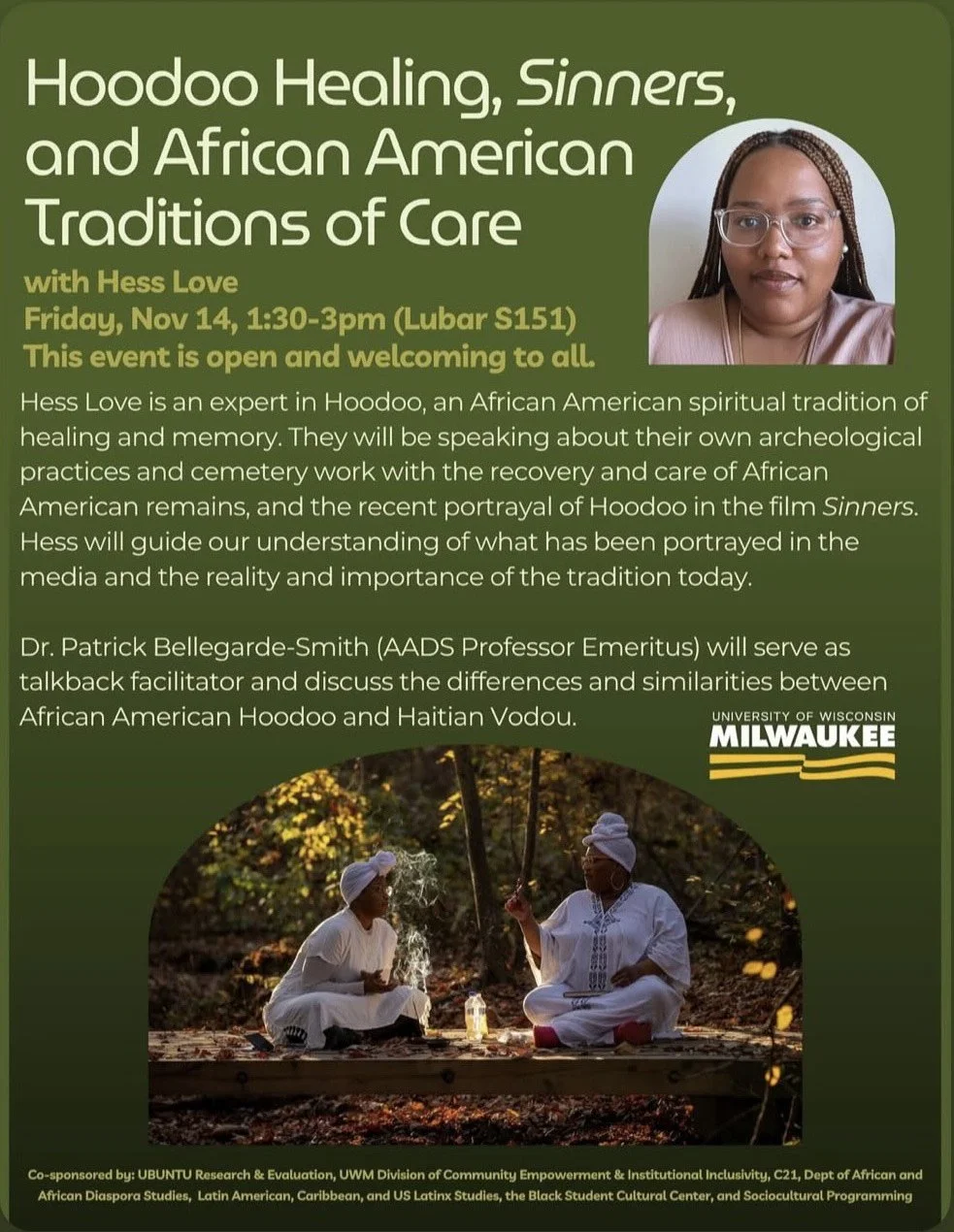 Please join the Department of African and African Diaspora Studies on Friday, Nov 14th for a talk with Hess Love entitled, “Hoodoo Healing, Sinners, and African American Traditions of Care.” Hess Love is an expert in Hoodoo, an African American spiritual tradition of healing and memory. They will be speaking about their own archeological practices and cemetery work with the recovery and care of African American remains, and the recent portrayal of Hoodoo in the film Sinners. Hess will guide our understanding of what has been portrayed in the media and the reality and importance of the tradition today.